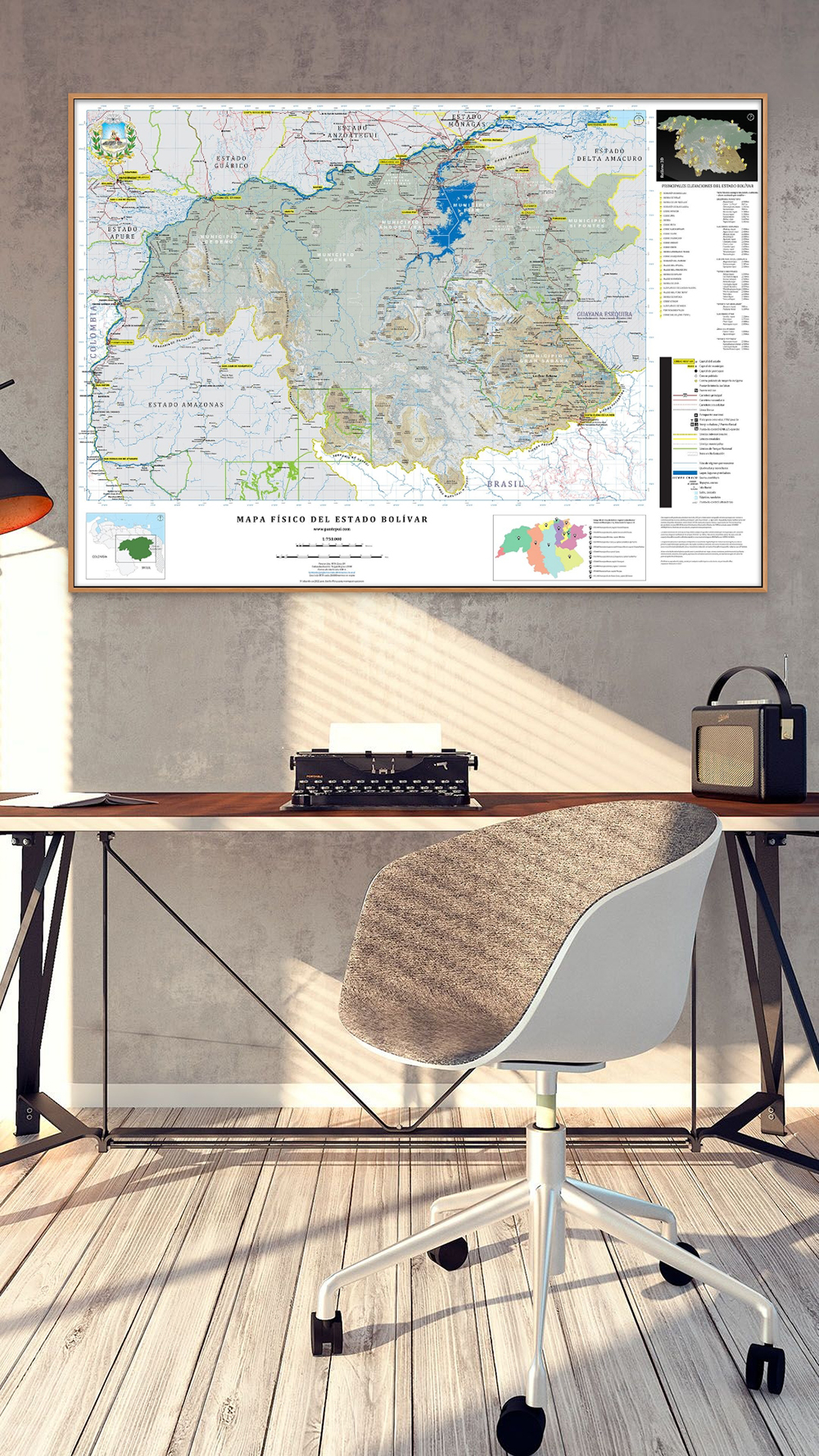 Este detallado y elegante mapa físico-político – del estado Bolívar, tamaño B0 (60 x 40 pulgadas o 1400 x 1000 mm), contiene una capa raster con el relieve general del terreno en muy alta resolución, coloreado con tintas hipsométricas las cuales hacen resaltar aquellas zonas más altas o superiores a la cota de los 1,200 m snm (Zona Pantepui). Conjunto con el relieve del terreno se encuentran curvas de nivel cada 200 m.